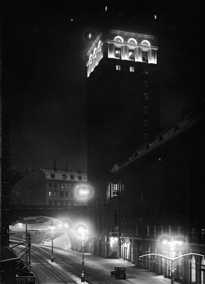 Bygggherre: Byggnadsaktiebolaget Contractor, Stockholm. Norra Kungstornet nattbelyst med restaurang "Babels Torn" högst upp.