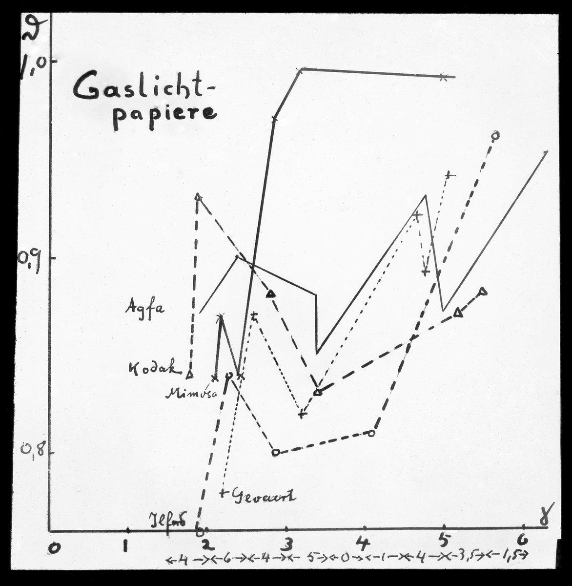 Skioptikonbild från institutionen för fotografi vid Kungliga Tekniska Högskolan. Använd av professor Helmer Bäckström som föreläsningsmaterial. Bäckström var Sveriges första professor i fotografi vid Kungliga Tekniska Högskolan 1948-58. Motiv föreställande "Kurvor för Gaslichtpapiere (Gasljght papper) - Agfa, lford, Gevaert, Kodak och Mimosa (för mer text se bilden).