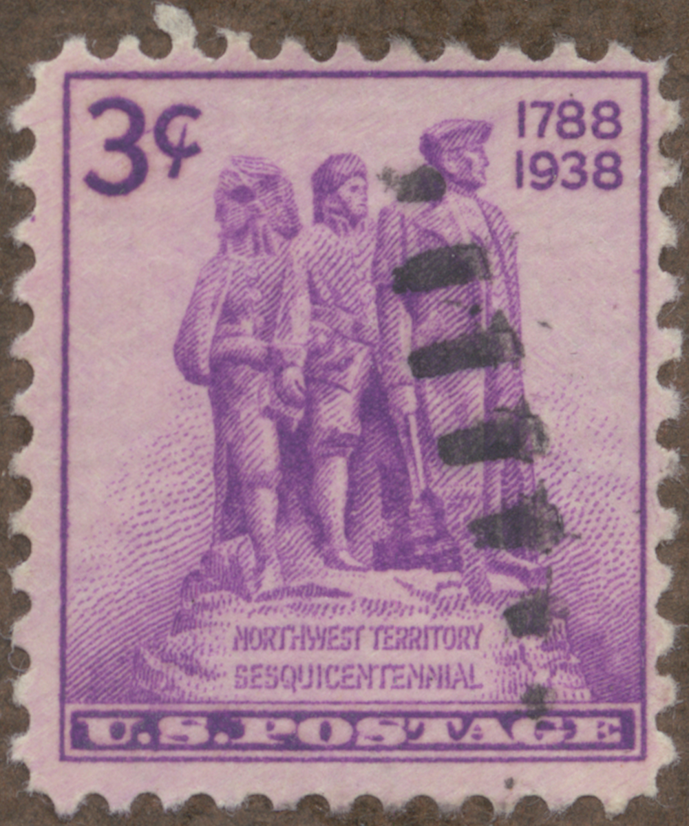 Frimärke från U.S.A., 1938. Motiv av Monument: Minne av nordvästra territoriernas kolonisation enligt förordning av 1787. -150-årsminne.