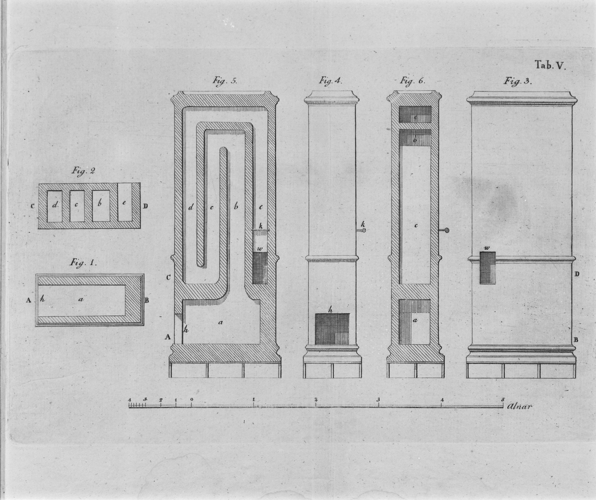Tryckt ritning till kakelugnar konstruerade av C.J. Cronstedt. Tab. V. Fig. 1-6 Ur Beskrivning på en inrättning af kakelugnar til weds besparning av C.J. Cronstedt. 1767.