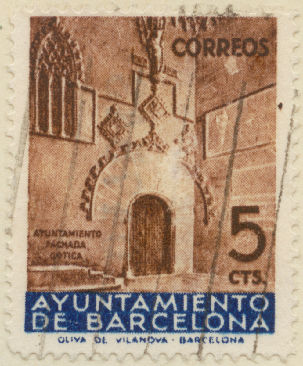 Frimärke från Spanien, 1936. Motiv av Stadshuset i Barcelona
