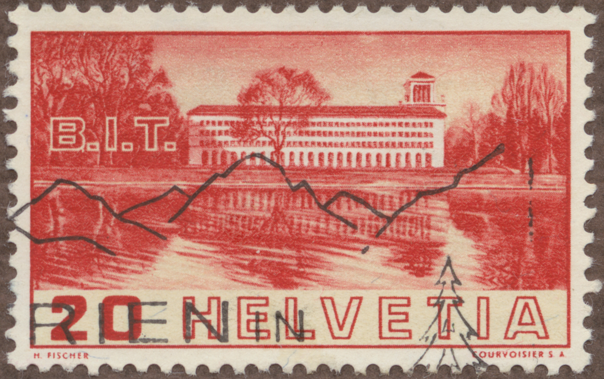 Frimärke från Schweiz, 1938. Motiv av B.I.T. Nationernas Förbund Byggnad i Geneve