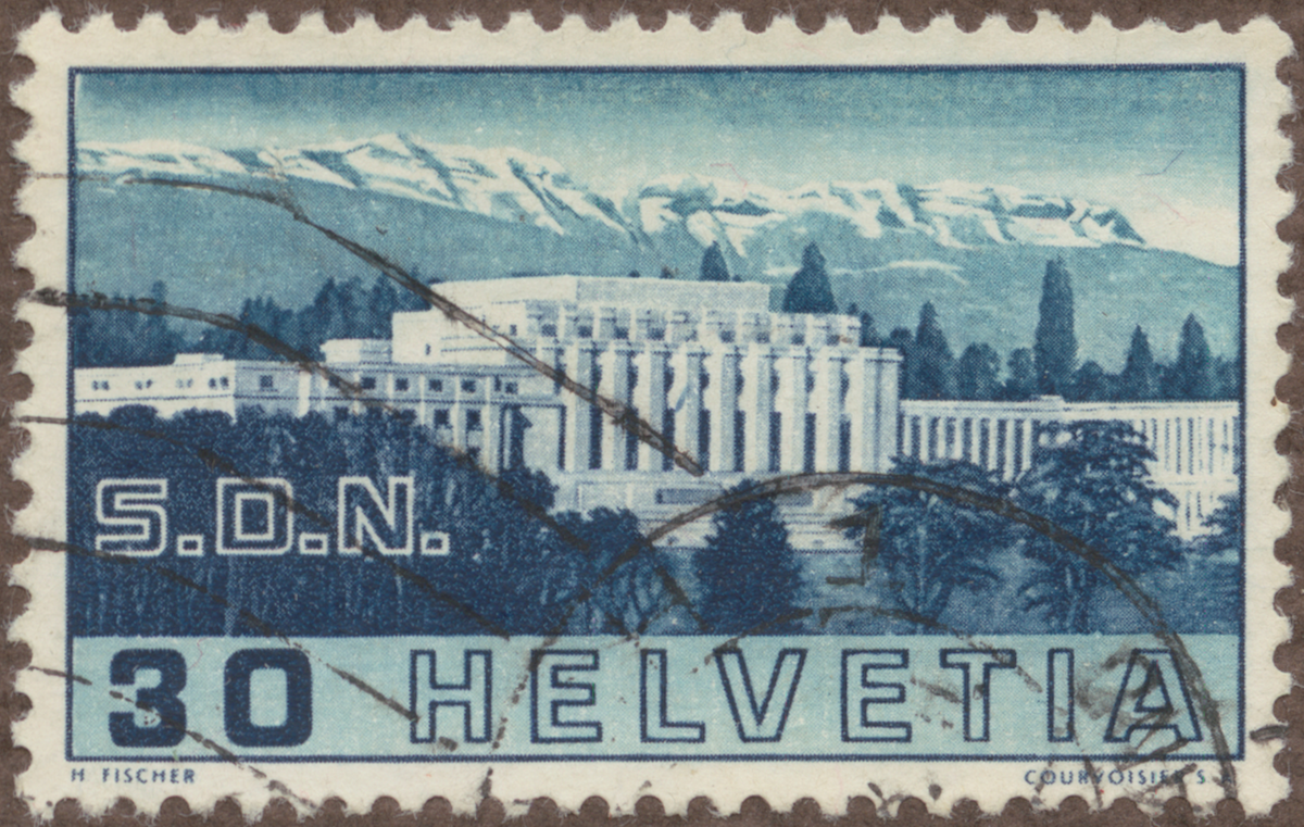 Frimärke från Schweiz, 1938. Motiv av S.D.N. Nationernas Förbund Byggnad i Geneve