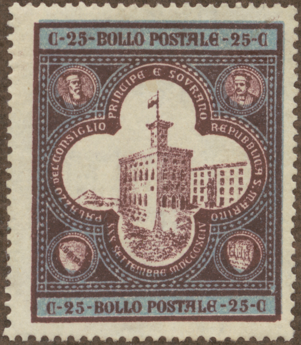 Frimärke från San Marino, 1894. Motiv av Guvernments Palatset i San Marino