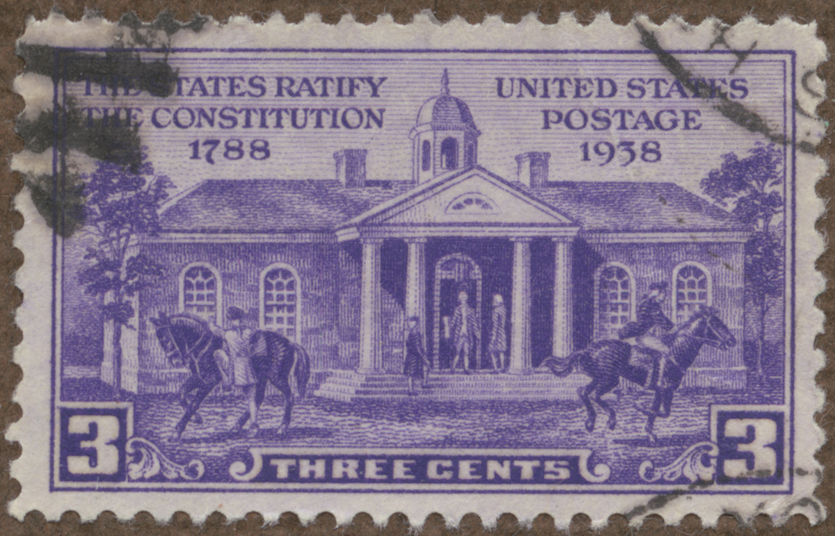 Frimärke från U.S.A., 1938. Motiv av Byggnad - 1700-tals tingshus: Konstitutionens ratificering 150 års minne 1788-1938.