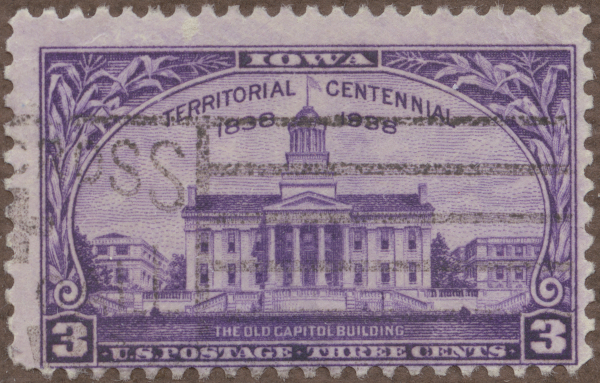 Frimärke från U.S.A., 1938. Motiv av Iowas gamla Capitoleumbyggnad Territoriet Iowas 100-års jubileum: 1838-1938. -(Obs.: Iowa fick statsrättigheter först 1846)