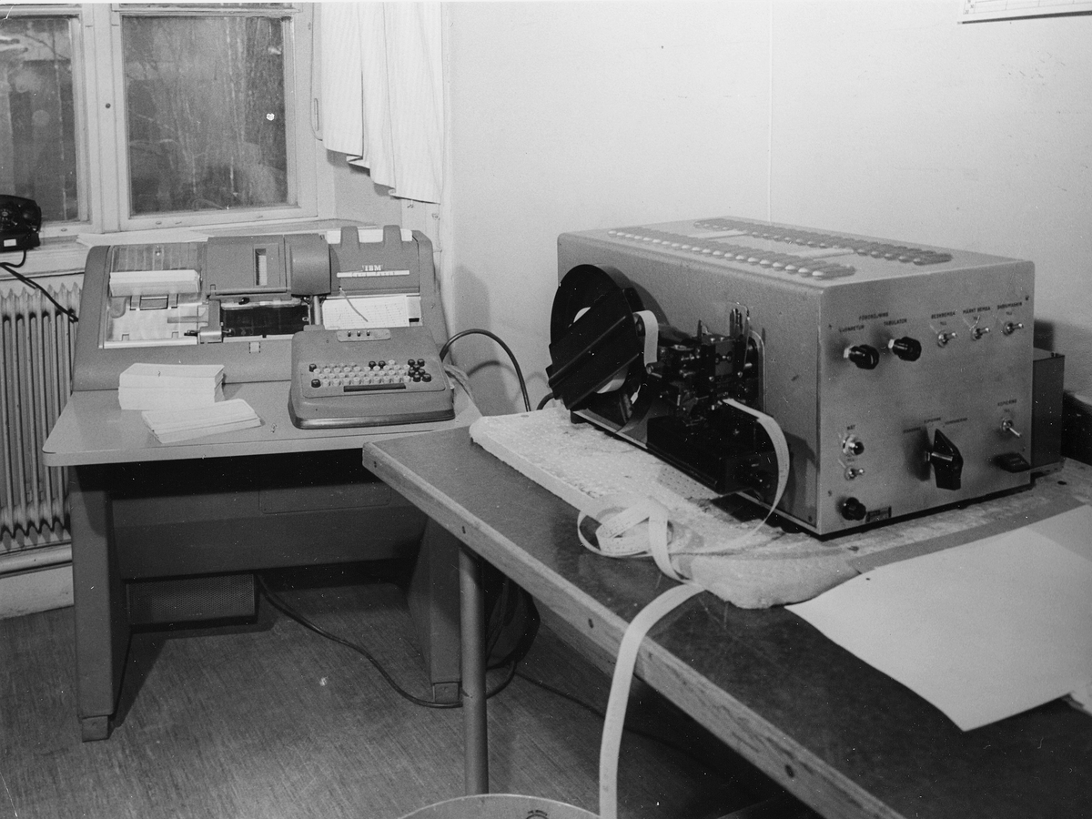 Matematikmaskinnämnden (MMN) vid Stockholms Högskola. I det här aggregatet omvandlas uppgifterna på hålkorten till en taperemsa, som sedan matas in i matematikmaskinen.