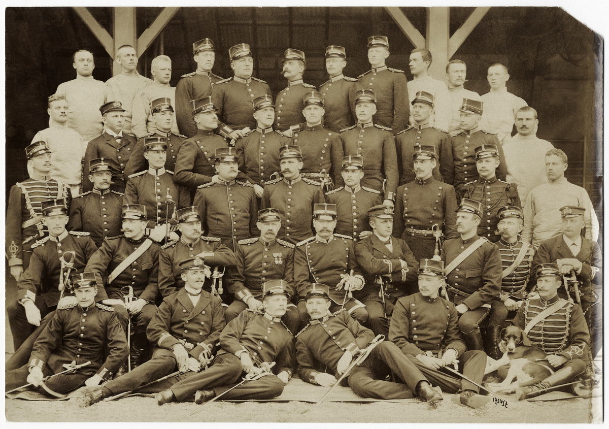 En gruppbild med blandade militärer (om man ser till uniformerna). Några är till synes klädda för fäktning.