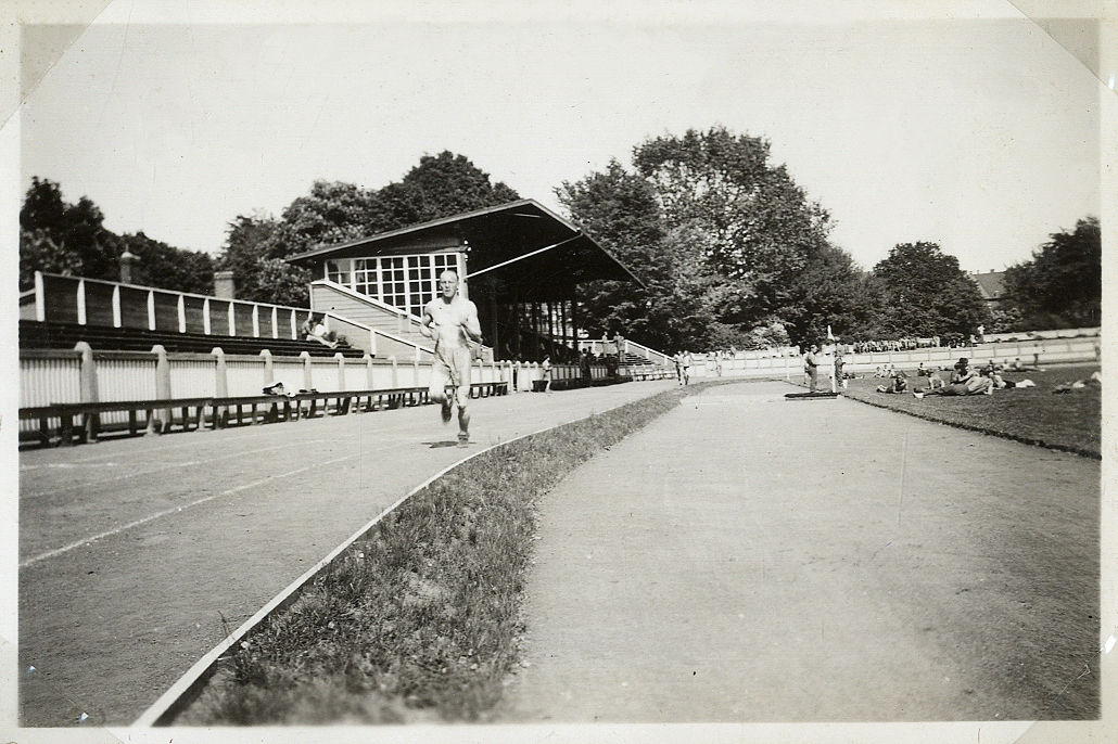 En man springer på löparbanan på Malmö idrottsplats (?). I bakgrunden vilar sig några av kamraterna på