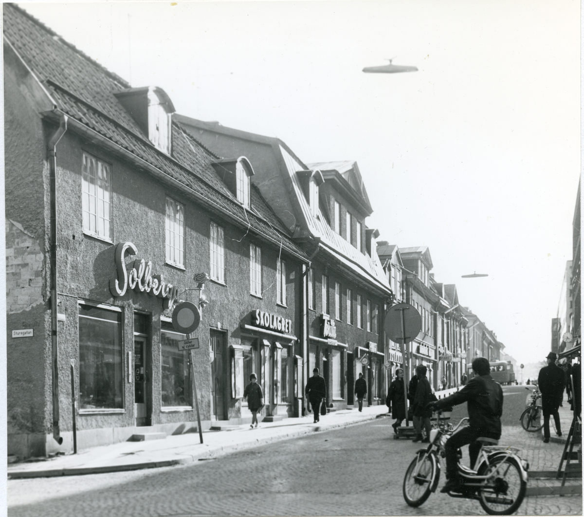 Stora gatan mot väster vid korsningen Sturegatan, 1960-talet.