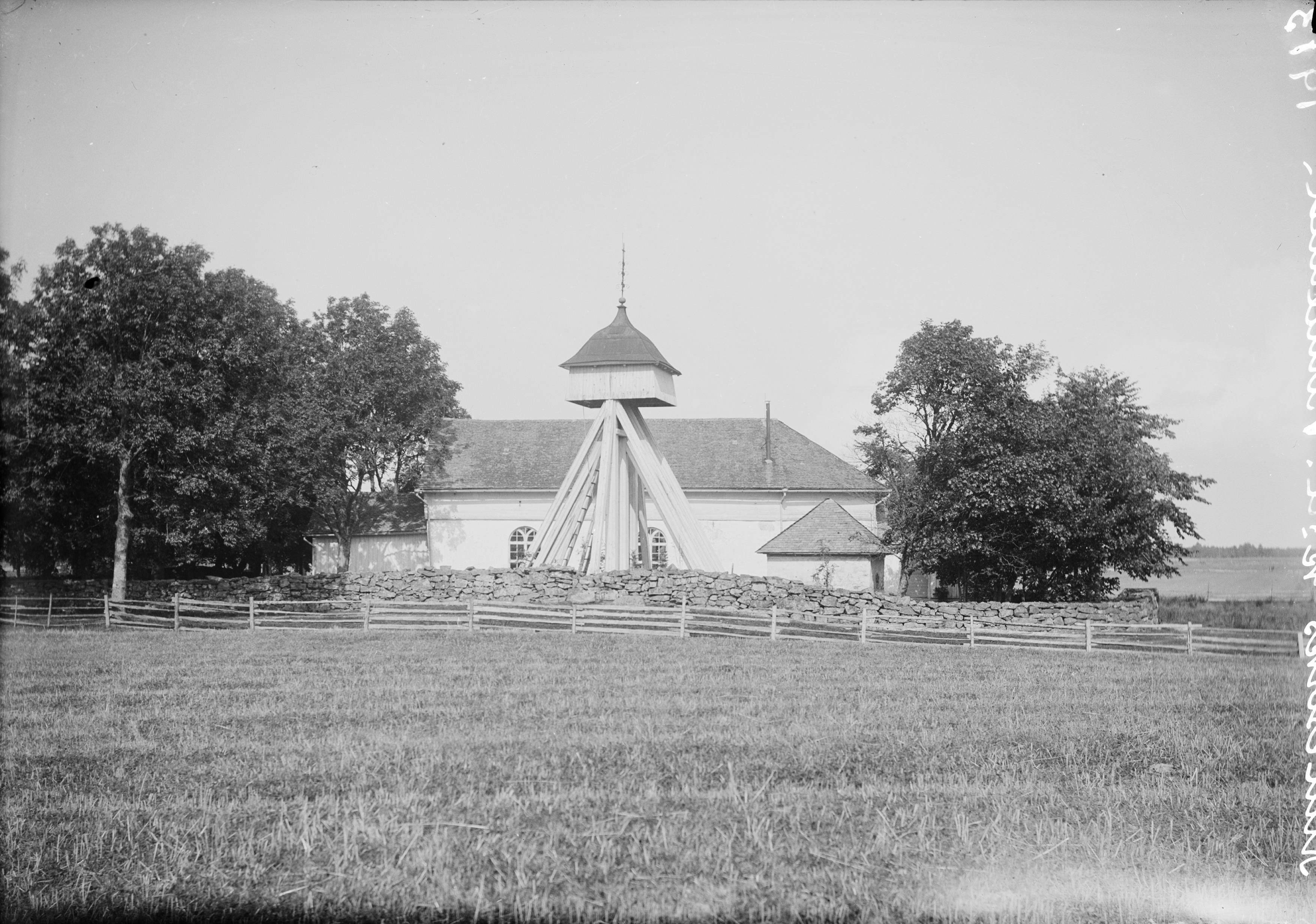Kyrkan mot söder med klockstapeln i förgrunden.