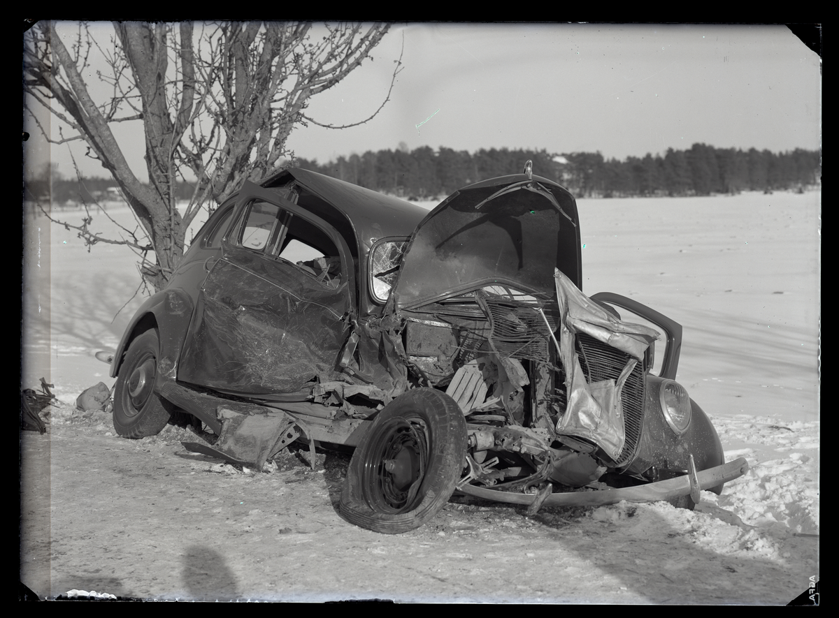 Titel: Krockskadad bil, Landsfiskal Andersson, Kolbäck, vid Munktorps station. Ur Gustaf Åhmans samling.