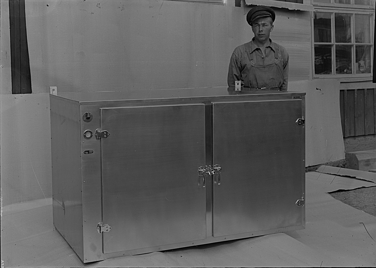 En man vid ett värmeskåp på AB Ergo elfabrik, Västerås.