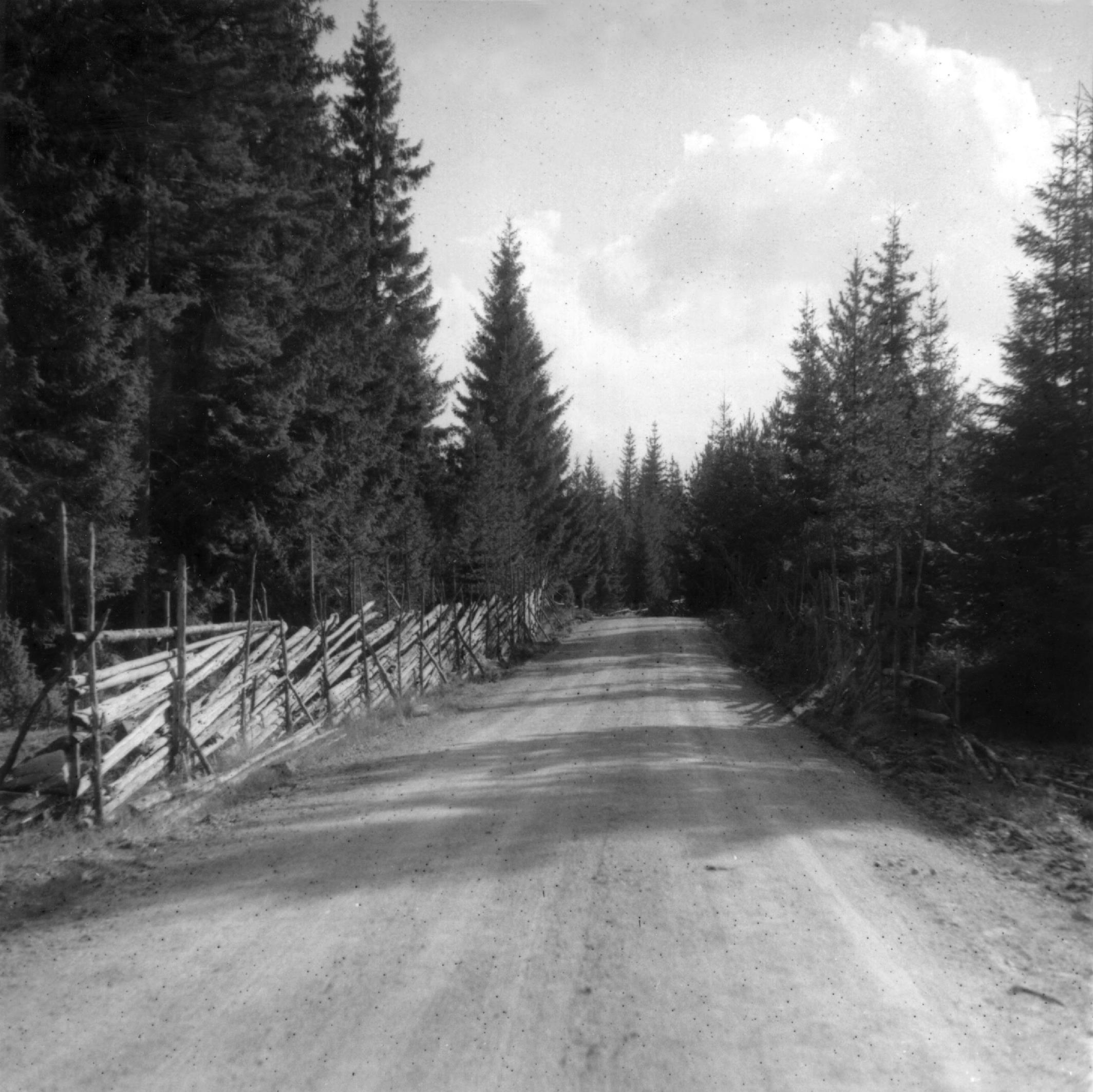 Byväg i utmarksgranskog flankerad av trägärdesgård.