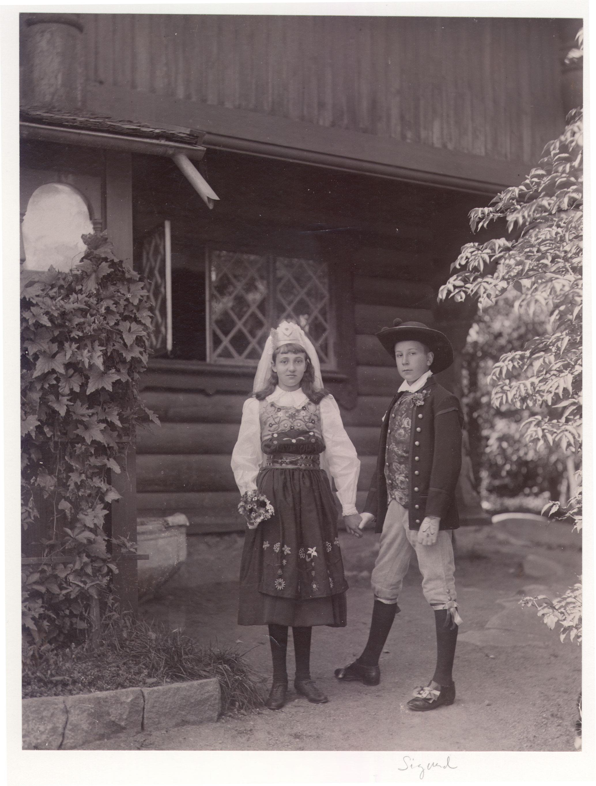 Två barn klädda i folkdräkter vid Lillstugan. "Brudpar vid 'bondbröllop' vid badortsmarknad". Elsa (?) Cnattingius och Sigurd Curman. Bilden från omkring 1890.