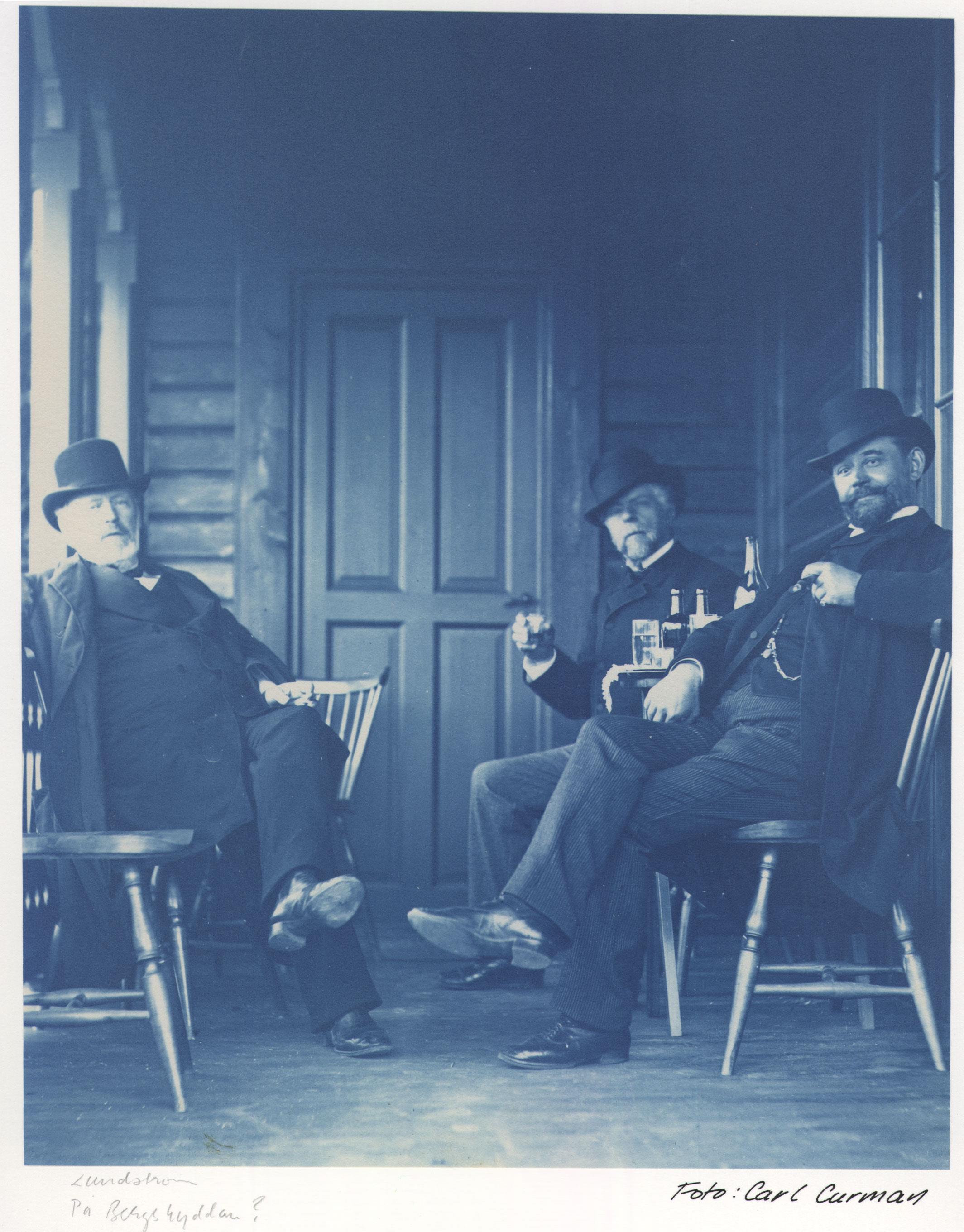 Bergshyddan, uppförd för C.F. Lundström (far till Calla Curman). C.F. Lundström och konstnärerna Fritz von Dardel och Alfred Wahlberg på Bergshyddans veranda.