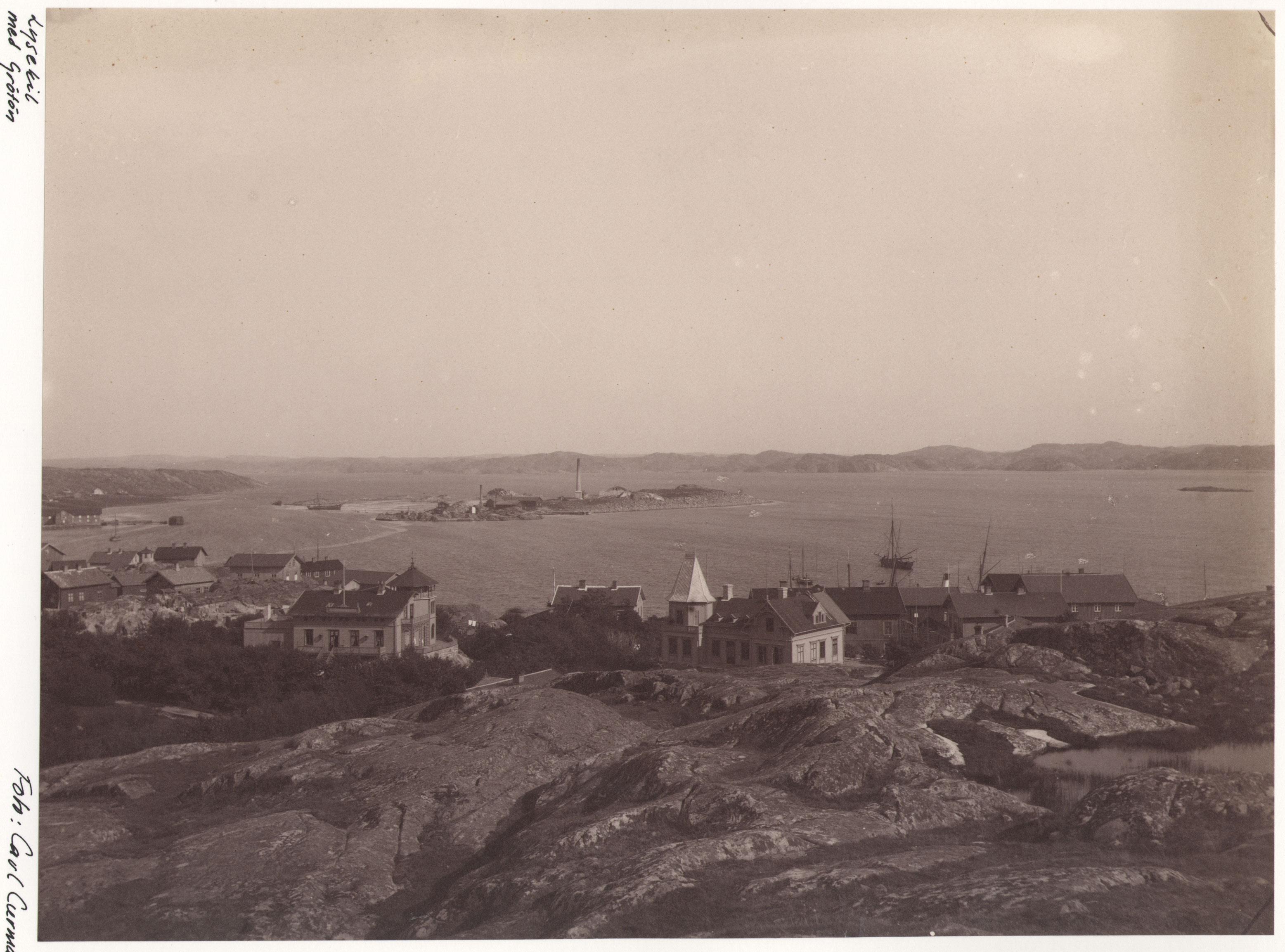 Vy över Lysekil och Grötö med skorstenen till fabriken. Från vänster till höger: Parkvillan (Parkhotel), tullhuset, konsul Radhes villa. Bilden är tagen före 1898.