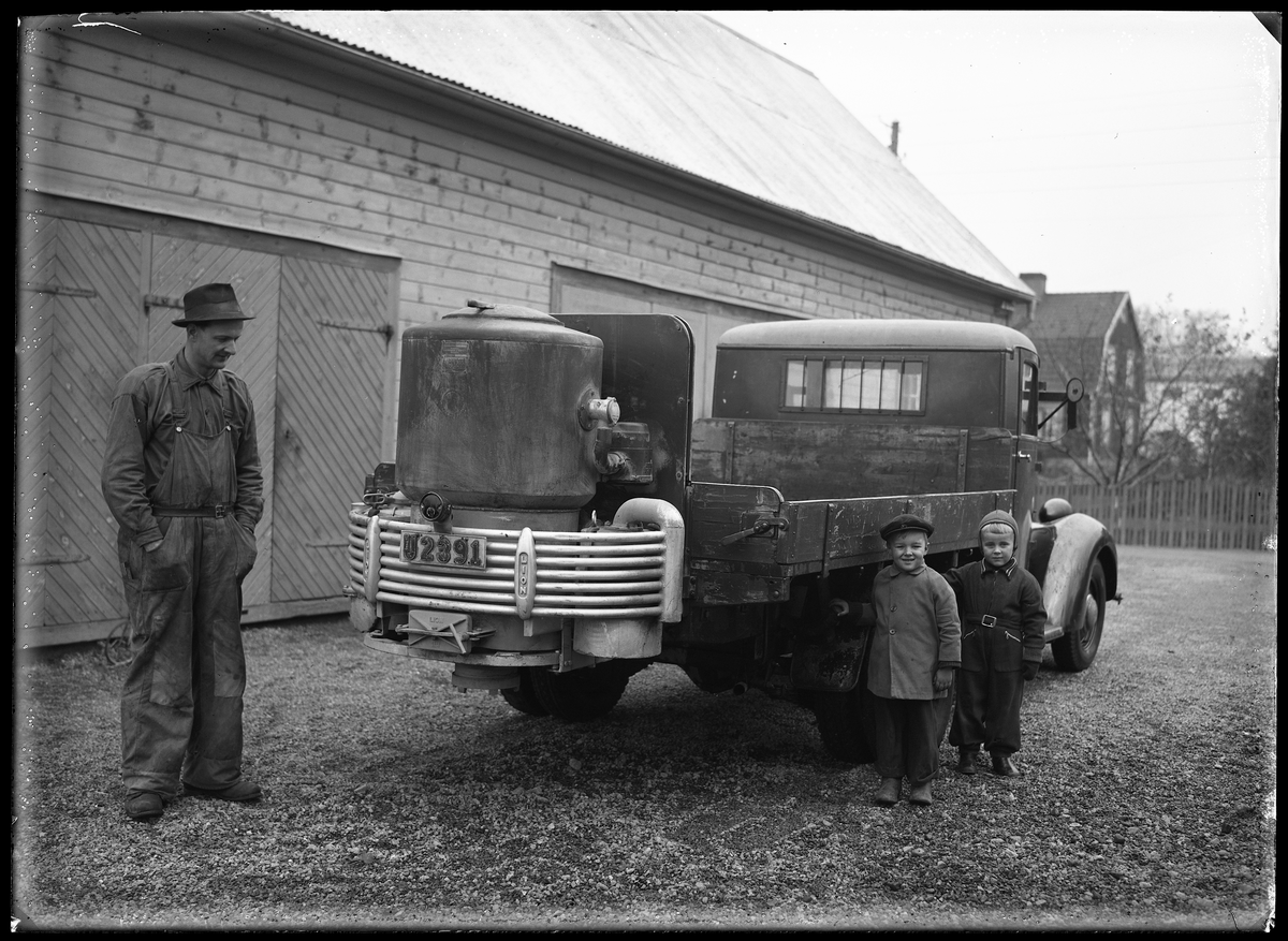 Människor framför fordon. Erik Pettersson, Kolbäck.