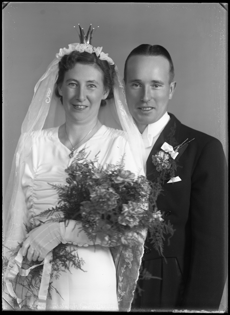 Titel: Bröllopsporträtt. Brudpar, Sigge Jansson, Gillbergavägen 47, Eskilstuna. Ur Gustaf Åhmans samling.