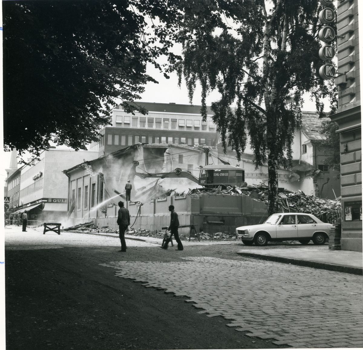 Titel: Västerås, Centrum, kv. Manfred. Rivningen av Svenska Handelsbanken, 1972.