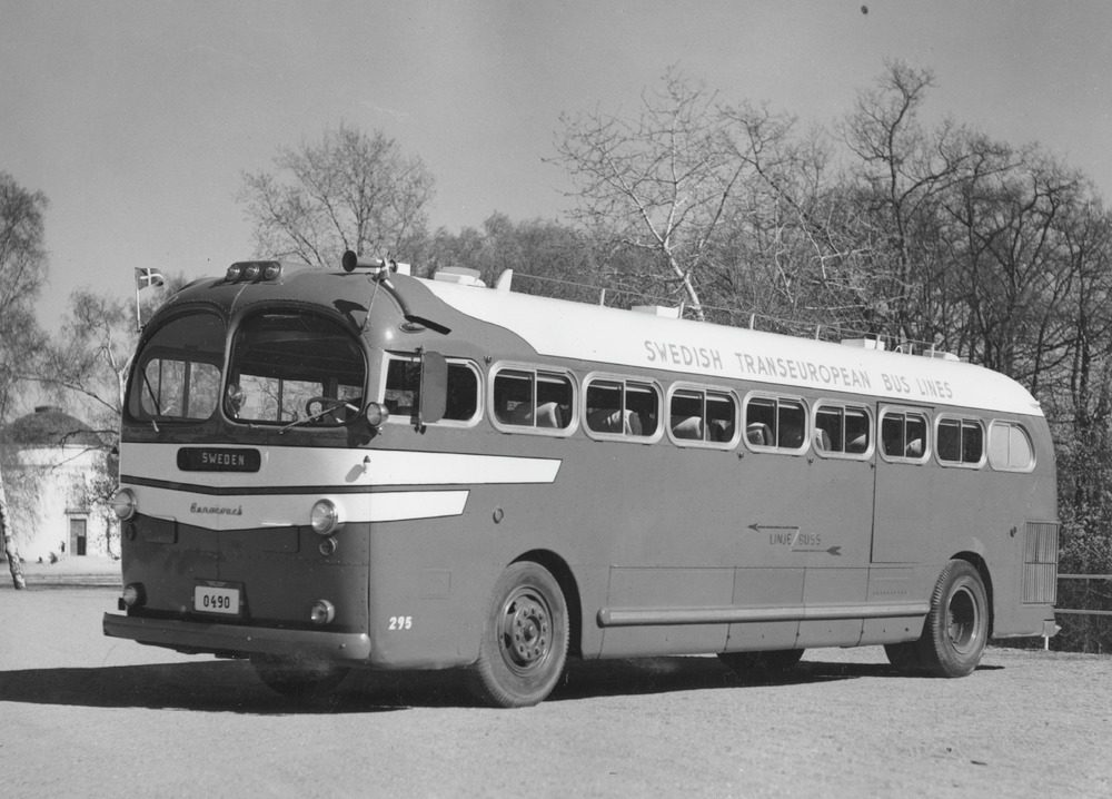 Svartvitt fotografi av en parkerad buss. Bussen står på en parkering eller grusplan. Synligt i bild är bussens för och dess ena långsida. I bakgrunden syns träd samt en vit byggnad med kupoltak till vänster i bild. På bussen, ovanför fönsterraden, står det "SWEDISH TRANSEUROPEAN BUSS LINES". På mitten av långsidan, en bit under fönsterna, finns Linjebuss logga. I bussens för, under den tvådelade framrutan, står det "Sweden". På båda sidor om framrutan finns två små svenska flaggor.