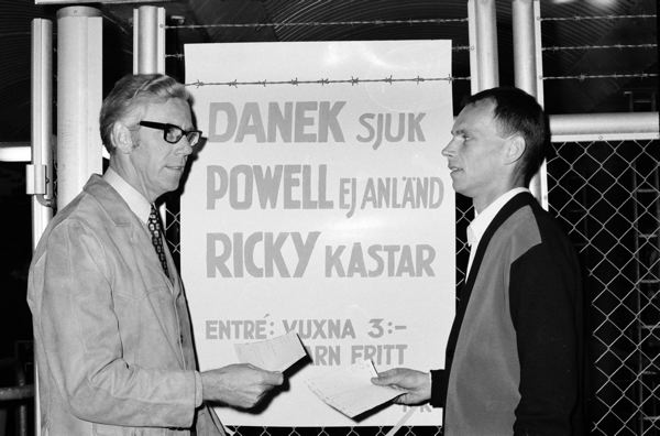 Friidrott, affisch vid Olympia. "De sena återbuden börjar bli ett gissel för arangörerna. Sven-Åke Nilsson och Torsten Carlius kan bara konstatera faktum."
