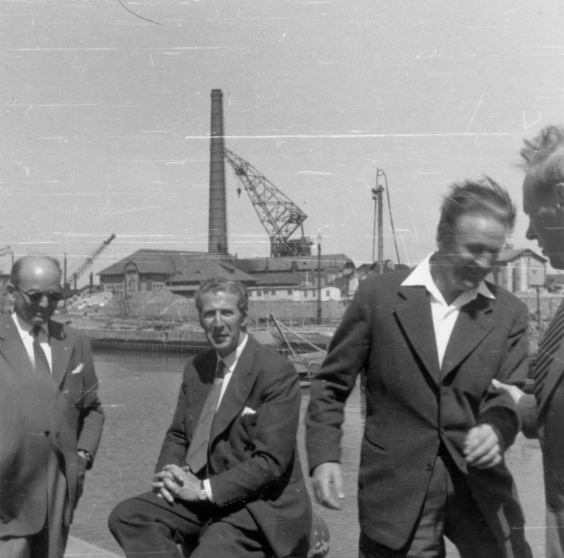 Svartvitt fotografi av en grupp om fyra män i icke namngiven hamn. De ser ut att befinna sig vid en kajkant. En av männen, andra från vänster, sitter på vad som troligtvis är en pollare intill kajkanten. Han håller sina händer knäppta ovanpå sitt ena lår och tittar in i kameran. Bredvid honom, längst till vänster i bild, står en man med solglasögon. Till höger om den sittande mannen befinner sig två män. Mannen längst till höger syns bara delvis. Han är vänd inåt i bild och har gripit tag om armen på mannen framför honom som ser ut att skratta och röra sig mot honom. I bakgrunden syns vatten och på andra sidan vattnet byggnader inklusive två höga skorstenar. Två lyftkranar syns också.