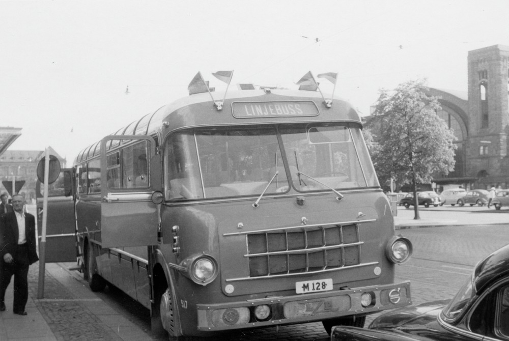 Svartvitt fotografi av en buss som står parkerad intill en trottoar i en icke namngiven europeisk stad. På bussens rullskylt, ovanför vindrutan, står det "LINJEBUSS". På vardera sida om skylten finns två vimplar placerade. Passagerardörren längst bak är öppen samt en mindre dörr längst fram. Bussen står med fören mot fotografen och trottoaren löper bredvid den i bildens vänstra nederkant. Framför bussen, i bildens nedre högerkant, skymtar bakdelen av en mörk bil. På trottoaren syns två män, en i höjd med bussen och en lite längre bak. Två trafikmärken, sedda bakifrån, står också på trottoaren. I bakgrunden syns några byggnader, träd och ett antal bilar på en parkering.