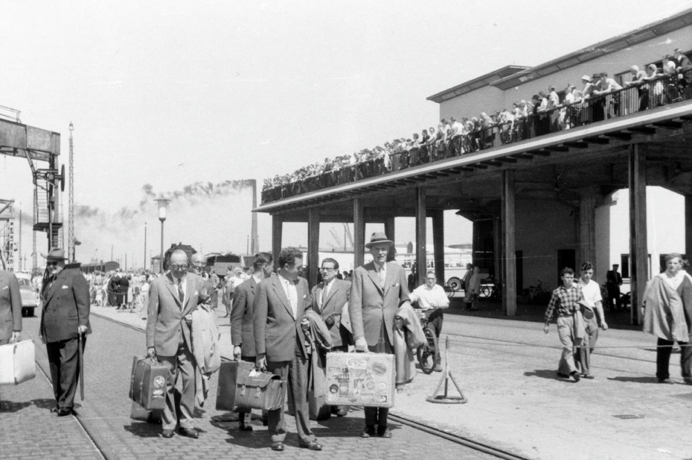 Svartvitt fotografi av en grupp om sex män med resväskor. De befinner sig troligtvis i en hamn. Bredvid dem till vänster i bild, står ytterligare två män. En med ett hopfällt paraply i handen. Den andra, som knappt syns, bär en resväska i sin vänstra hand. Bakom dem, i bildens vänsterkant, syns någon form av upphöjda metallkonstruktioner. Till höger om dessa syns en större samling människor samt tågvagnar och bussar. Längst bort i horisonten ser det ut att finnas master och stora lyftkranar. Bakom männen, åt höger i bild, finns en upphöjd byggnad. En stor balkong som stöttas upp av höga pelare skjuter ut från den. På balkongen står det ett stort antal personer, enda ute vid räcket. Många ser ut att titta mot något åt vänster, inåt i bilden. Nere på marken, precis till höger om gruppen män som står ungefär mitt i bilden, skymtar en man som leder en cykel och snett framför honom går tre äldre pojkar.