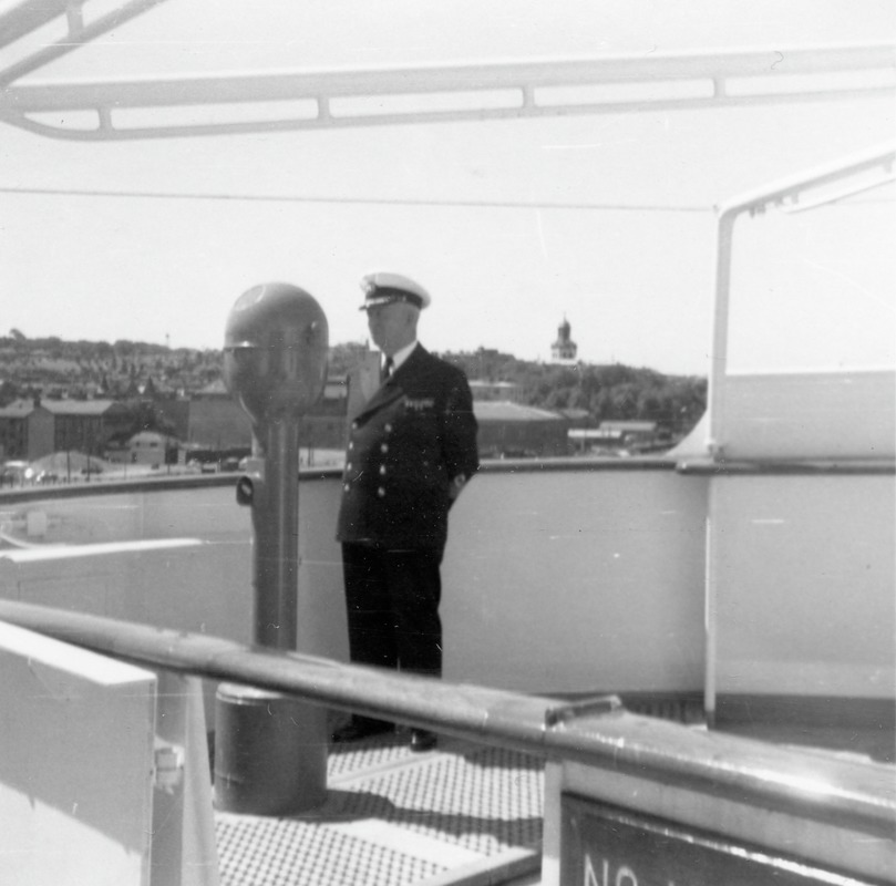 Svartvitt, suddigt fotografi av en man i uniform ståendes, med händerna bakom ryggen, på däck på ett fartyg. Han står ungefär mitt i bilden, framför någon form av utrustning som tillhör fartyget. Det ser ut som en pelare och är nästan lika högt som honom. I bakgrunden syns byggnader, ett kyrktorn och träd.