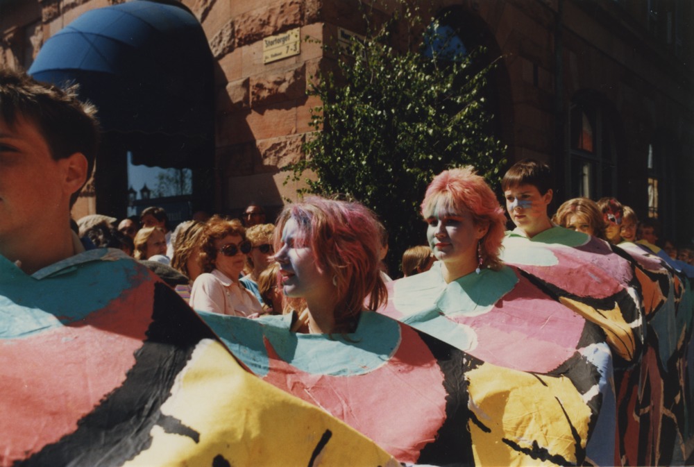 Bilden är tagen på Stortorget där huvudfotingen tågar. Elevernas huvuden sticker upp ur dräkten.