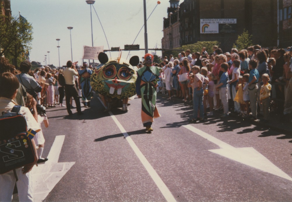 Bilden är tagen på Drottninggatan och huvudfotingen syns framifrån. Joseph Schibli går framför och längs gatan står människor och tittar.