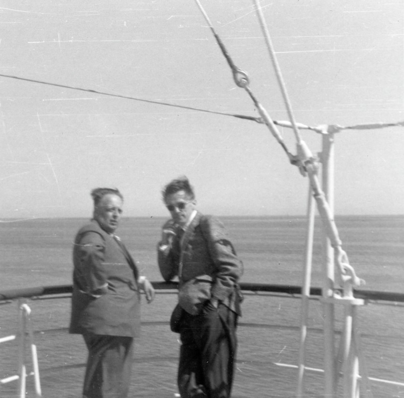 Svartvitt fotografi av två män som står och lutar sig mot relingen på ett fartyg. De står vända mot varandra men båda har vänt huvudet och tittar in i kameran. Mannen till höger i bild har solglasögon och sin högra hand uppe vid ansiktet. Vänster hand har han i byxfickan. Mannen till vänster håller sin högra hand i sidan och lutar sin vänstra underarm mot relingen. Enbart handen är synlig. De står ungefär mitt i bilden och i bakgrunden breder ett öppet hav ut sig. Längst till höger i bild syns vitlackerade fästanordningar och vajrar som tillhör fartygets konstruktion.