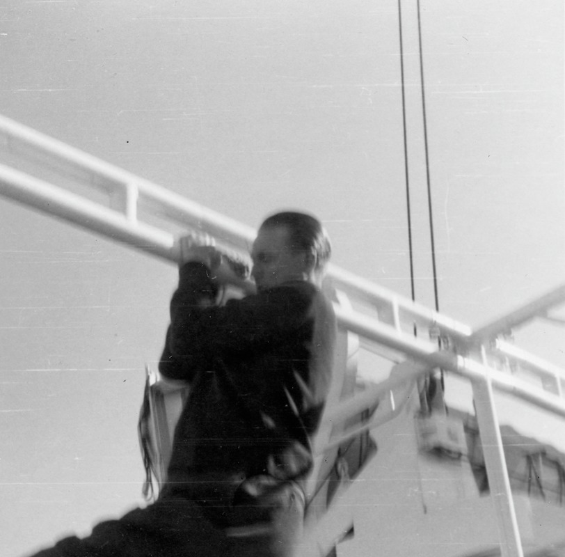 Svartvitt, suddigt fotografi av en man utomhus på ett fartyg. Han har greppat tag med båda händerna i någon form av balk som tillhör fartygskonstruktionen. Han har sedan dragit sig upp så att hans huvud är i höjd med hans händer. Han ser ut att ha kostym och håret ligger i en bakåtkammad frisyr. I bakgrunden syns andra, ej tydligt vilka, delar av fartyget.