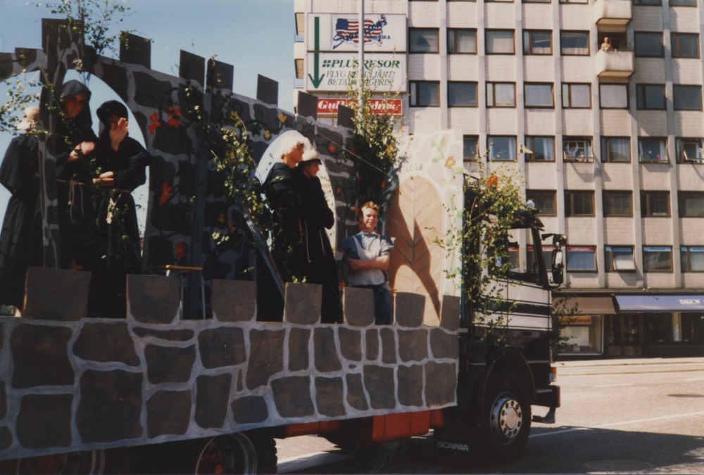 En lastbil kör en "scen" nära Sankt Jörgens plats. På flaket syns personer utklädda till munkar som tittar ut genom gluggar som troligen skall efterlikna Kärnan.