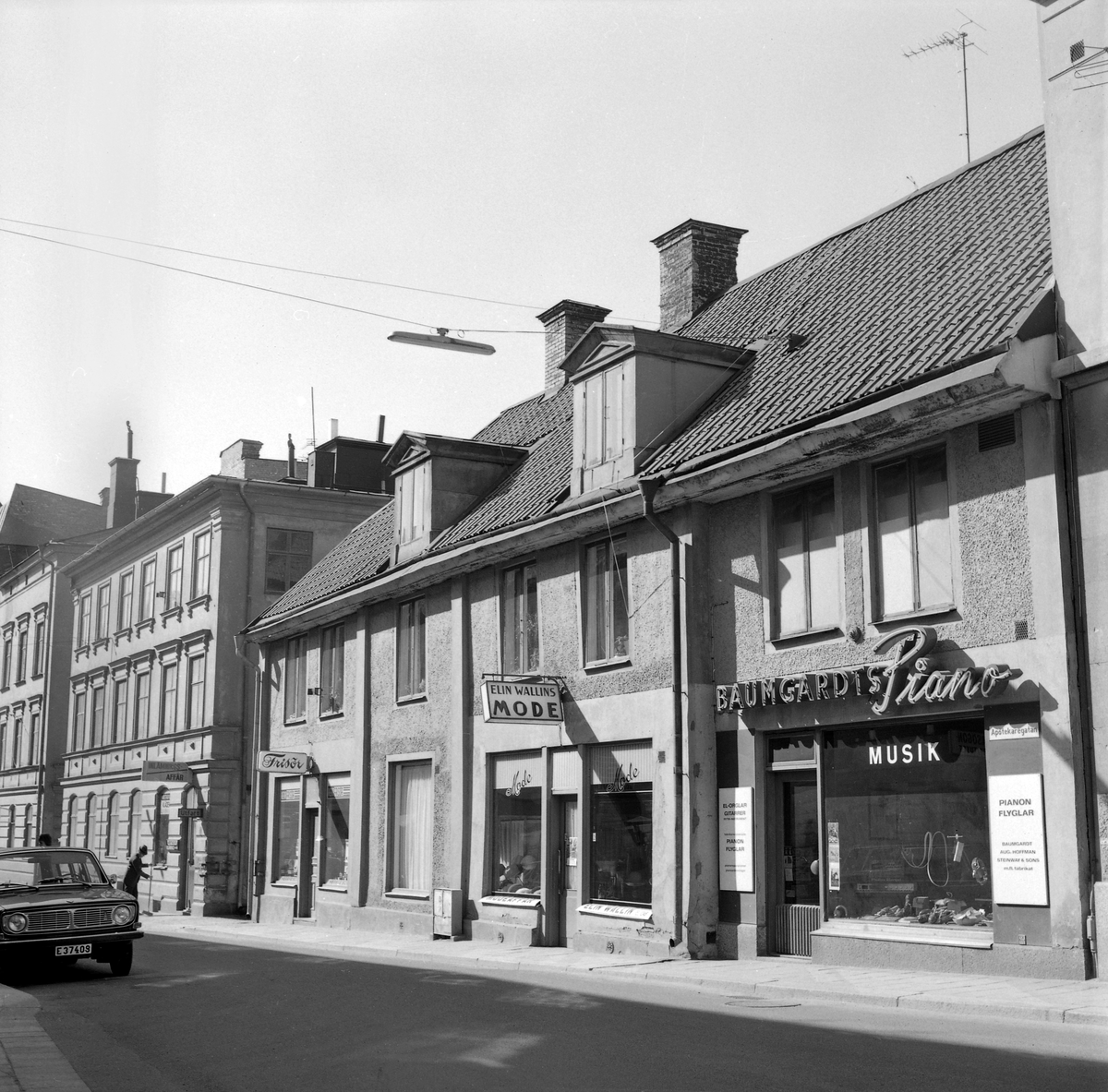 Parti av Apotekaregatan i Linköping. Närmast Apotekaregatan 8 som länge inrymde den i staden välkända musikaffären Baumgardts Piano, vid sidan av Herta Wallmans långvariga modebutik. Elin Wallin hade startat firman och hennes goda renommé fick Herta att behålla namnet. Foto 1972.