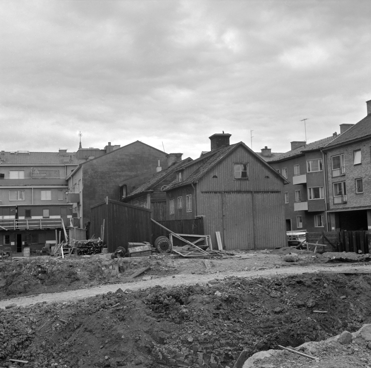 Linköping 1965 och ett av många exempel av rivningsytor i staden vid tiden. I kvarteret Braxen hade byggnadsarbetena av det gigantiskt EPA-varuhuset med vidliggande kontorsytor påbörjats. Byggnadskomplexet skulle komma att fylla närmast hela kvarterets utbredning och därtill krävdes omfattande rivningar av den föregående bebyggelsen. Här en vy längs kvarterets sträckning utmed Snickaregatan, där de gamla trähusen Snickaregatan 18 och 20 stod i tur att rivas.
