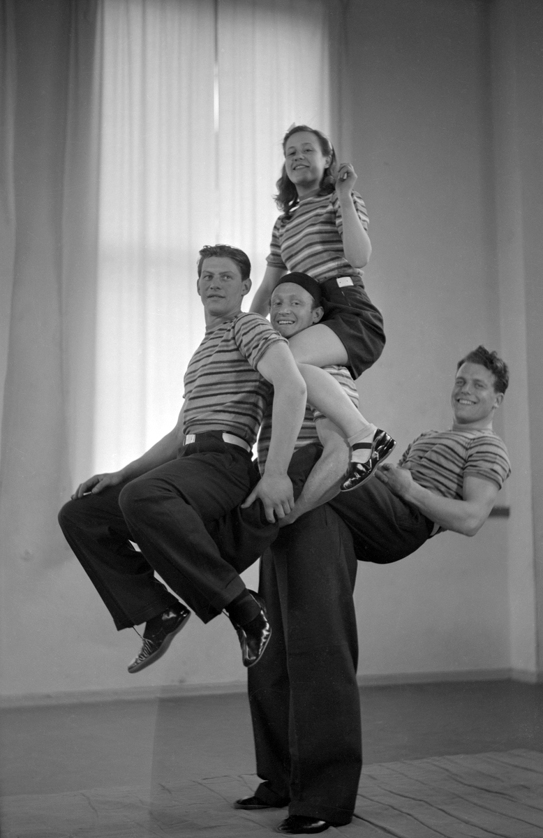 Akrobatikgrupp som torde hört talas om sig när det begav sig. Bilden ingår i en serie av Linköpingsfotografen Sven Källberg, vilket möjligtvis placerar gruppen i staden med omnejd. Någon som har upplysningar? Daterad 1945.