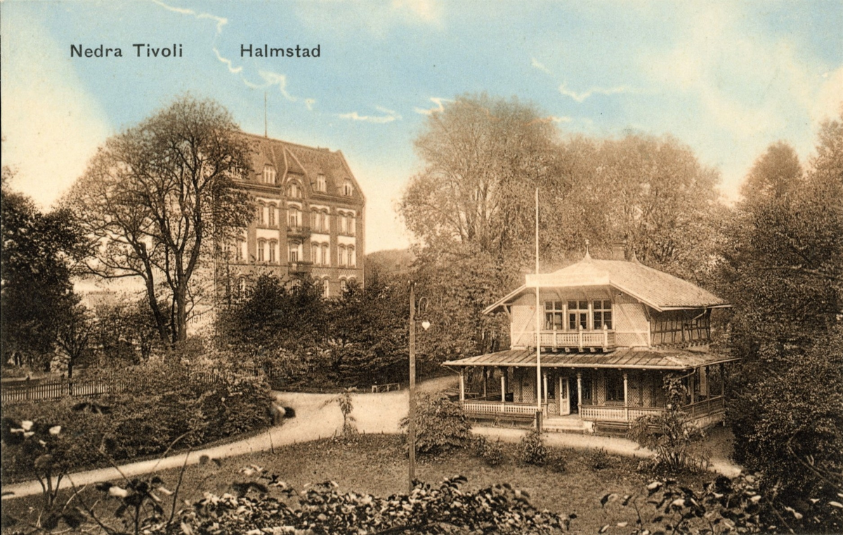 Kolorerat vykort, "Nedra Tivoli Halmstad". Vy över Nykterhetskaféet i parken. På skylten över balkongen stod det "Nykterhetsfolkets kafé och läsrum". I bakgrunden ett flervåningshus.