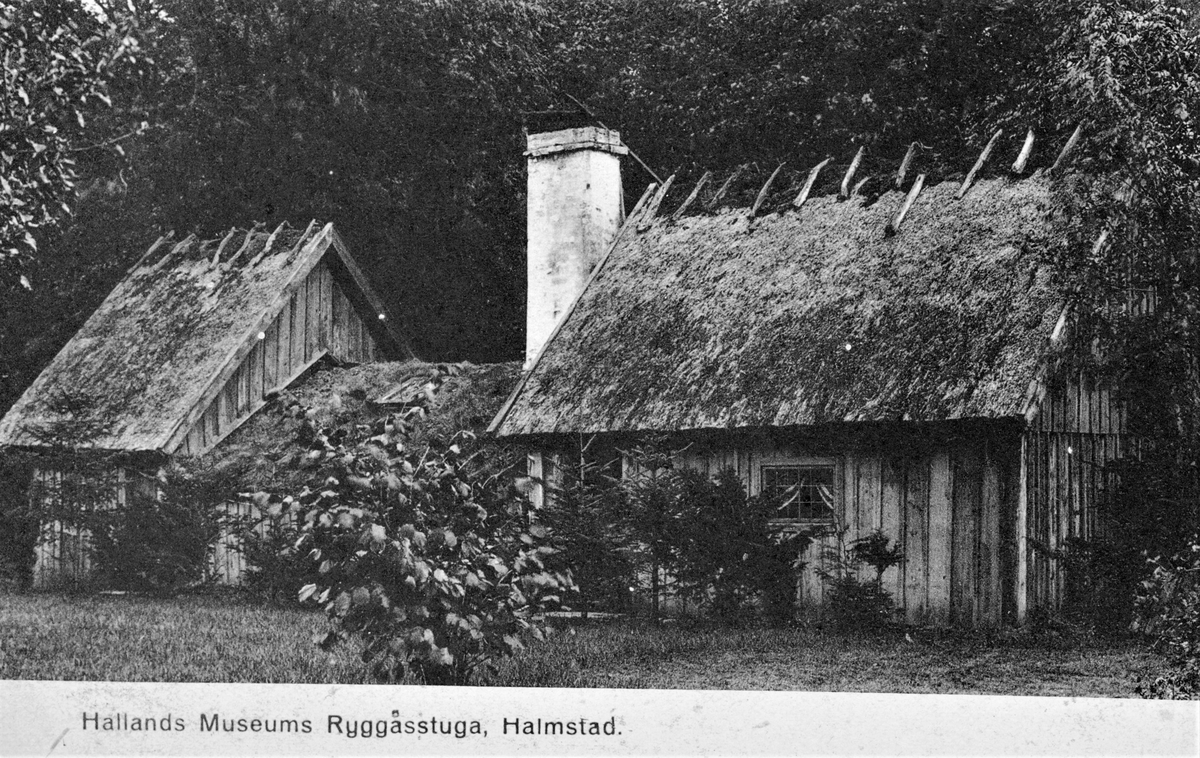Vykort, "Hallands Museums Ryggåsstuga, Halmstad." Närbild på stugan inunder stora lövträd.