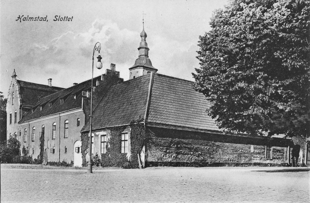 Vykort, "Halmstad, Slottet." Byggnaden sedd över hörn så att tre olika slottslängor syns, samt tornet som skjuter upp i bakgrunden. Flera av slottets fönster står på vid gavel. I förgrunden en lyktstolpe.
