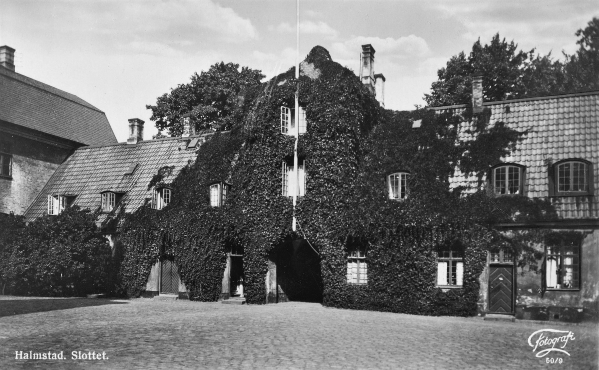 Vykort, "Halmstad, Slottet." Slottslänga sedd från innergården med portgång. Fasaden och delar av taket är övervuxna med någon klängväxt. Flera fönster står på vid gavel. På kortets baksida sitter en stämpel: Försvarsstaben Luftförsvarsavd.