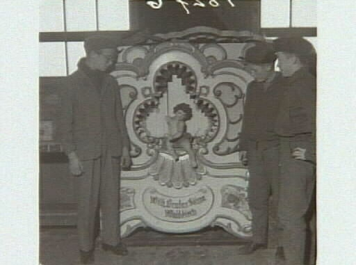 Karusellspelverk från auktionen i Träslöv. Artikel i samband med bilden publicerad i Varbergs Tidning 1955-12-07.