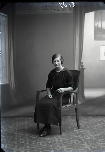 Porträtt, kvinna i helfigur som sitter. Ateljébild. Beställare: Anna Bengtsson, Träslöv.