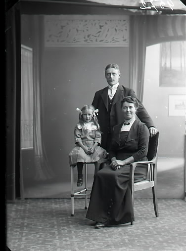 Familjebild, föräldrar med flicka som sitter på ett litet trekantigt bord och modern på en stol. Fadern står bakom. Ateljébild. Beställare: Oscar Engdahl, Träslöv.
