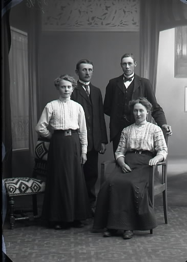 Ateljébild med två kvinnor och två män i helfigur varav en av kvinnorna sitter. Beställare: Johan Nilsson, Träslöv nr 12.