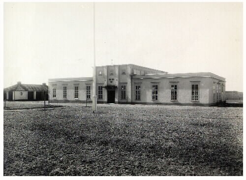Grimetons radiostation, sannolikt som relativt nybyggd. Huvudbyggnad samt sidobyggnad samt flaggstång.