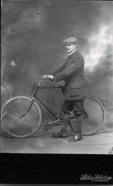 Skräddare Hjalmar Carlsson med cykel, ateljébild