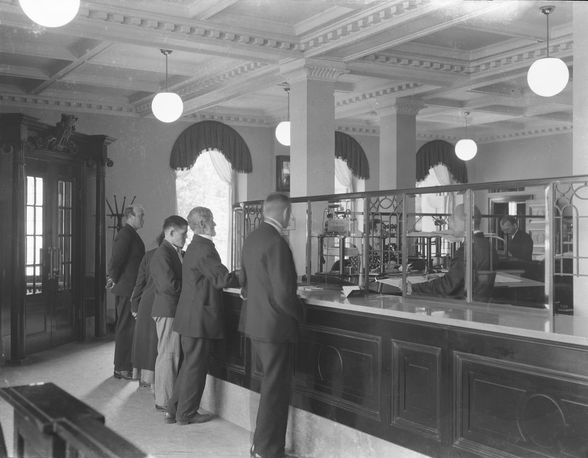 Interiörbild från expeditionslokalen i Varbergs sparbank. Mannen bakom disk till höger heter Arvid Adolfsson. Fönstren i bakgrunden vetter mot öster. Till en början hade man banklokaler på bottenvåningens östra del medan Hallandsbanken och Göteborgsbanken hyrde lokaler i den västra.