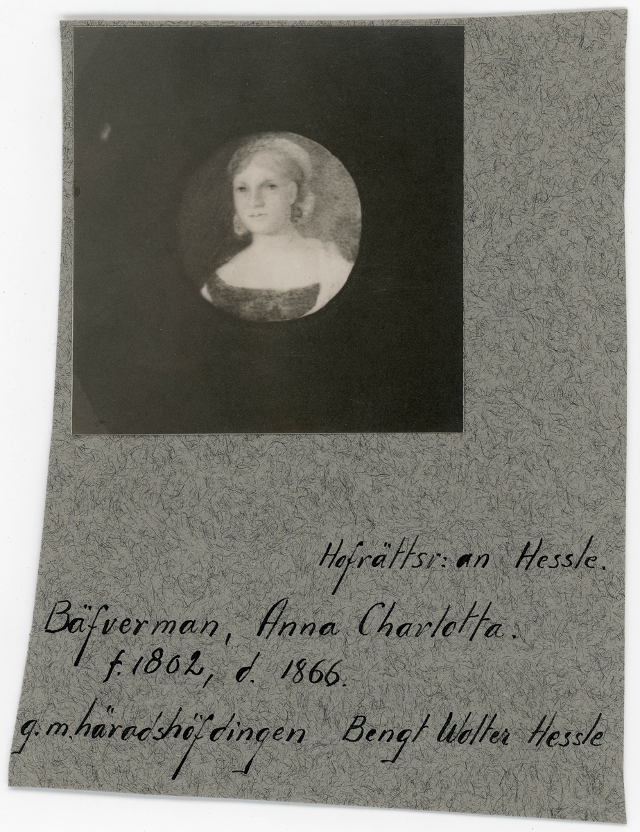 Porträtt på Anna Charlotta Bäfverman född år 1802 död år 1866, gift med häradshövding Bengt Wolter Hessle.